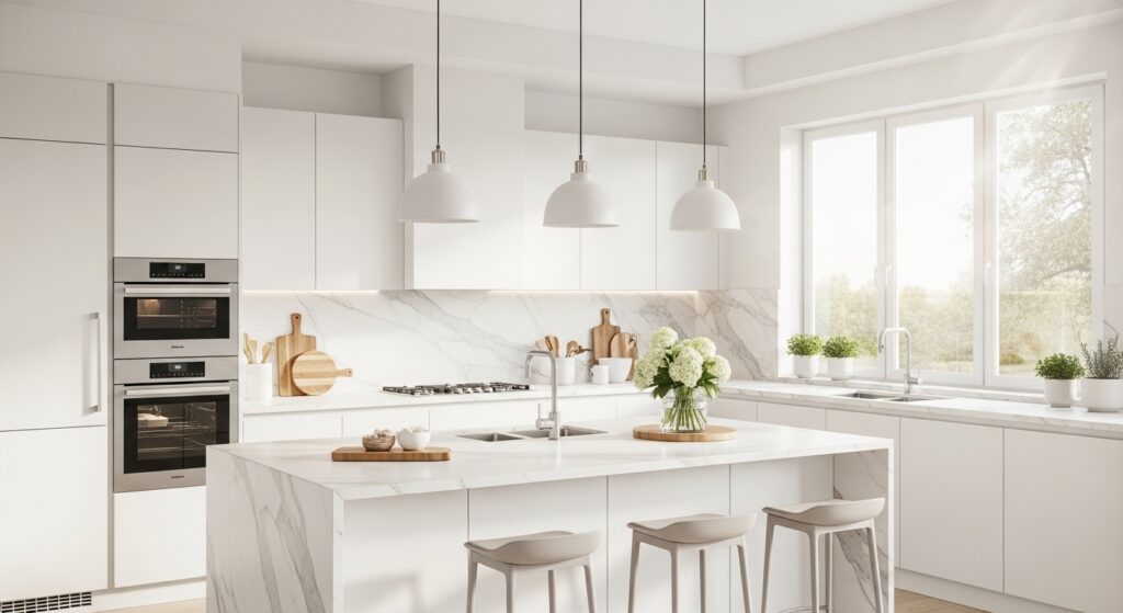 An all-white kitchen offers a timeless canvas, a bright and airy foundation that can be adapted to fit any personal