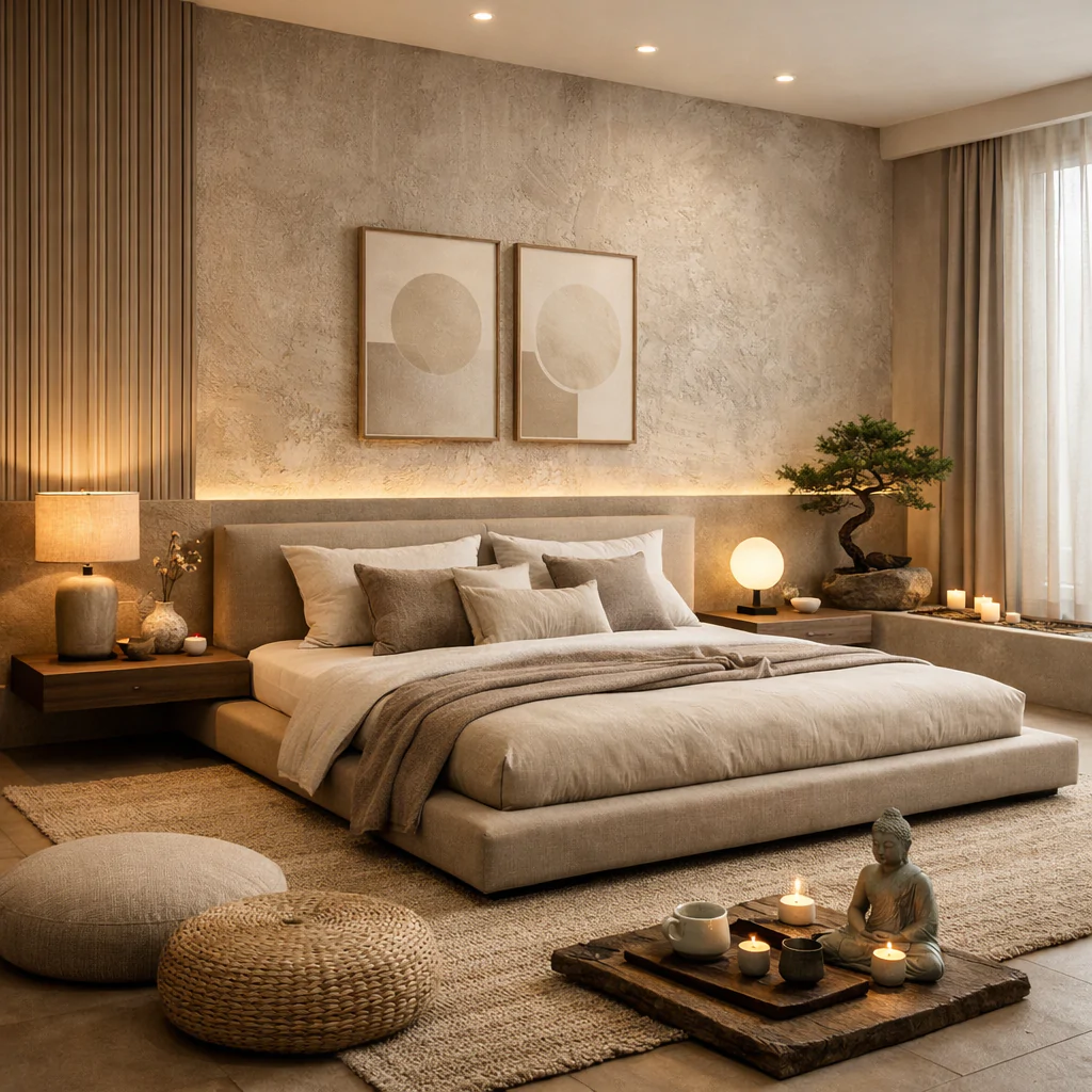 Layer zen bedroom ideas master suite neutral tones like beige, taupe, and soft grey. Add textured walls for a modern edge with zen bedroom ideas master suite modern styling.