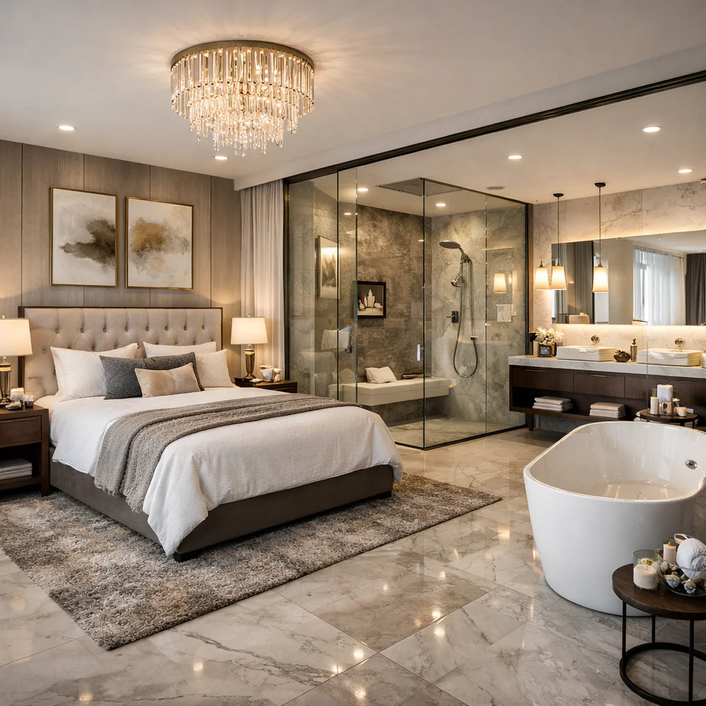 When planning bedroom ideas master suite design layout, think flow. Open-plan concepts that combine bedroom and bath create a spa-like feel.