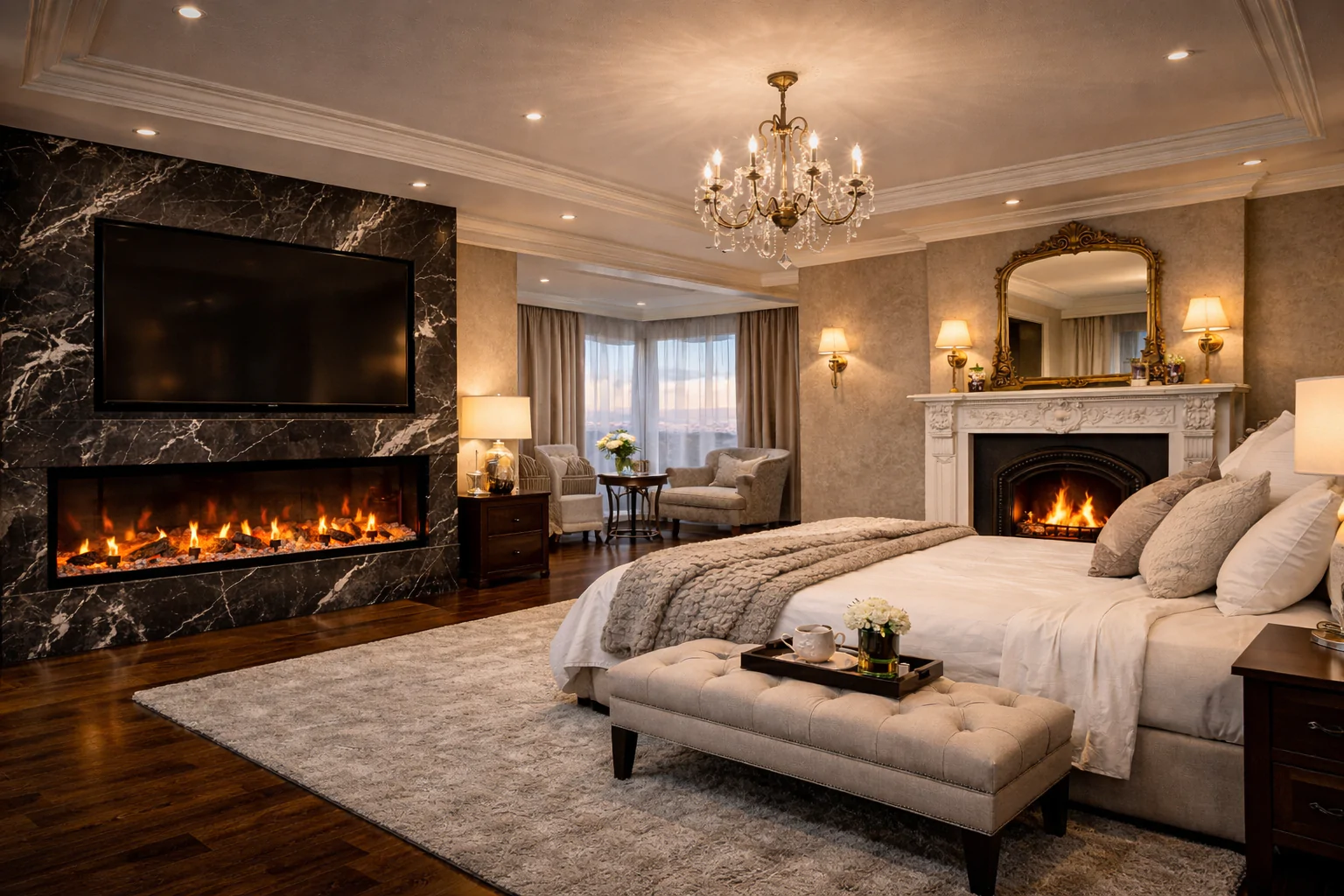 A fireplace pairs perfectly with hotel bedroom ideas master suite styling for five-star vibes.
