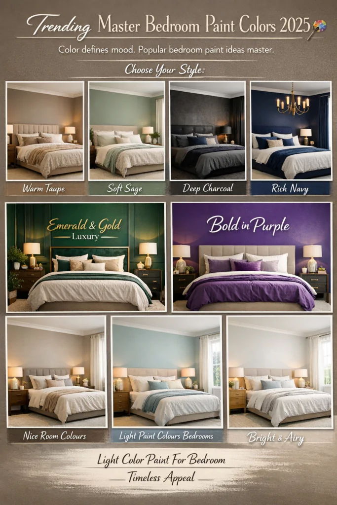 Color defines mood. Popular bedroom paint ideas master color 2025 include:
