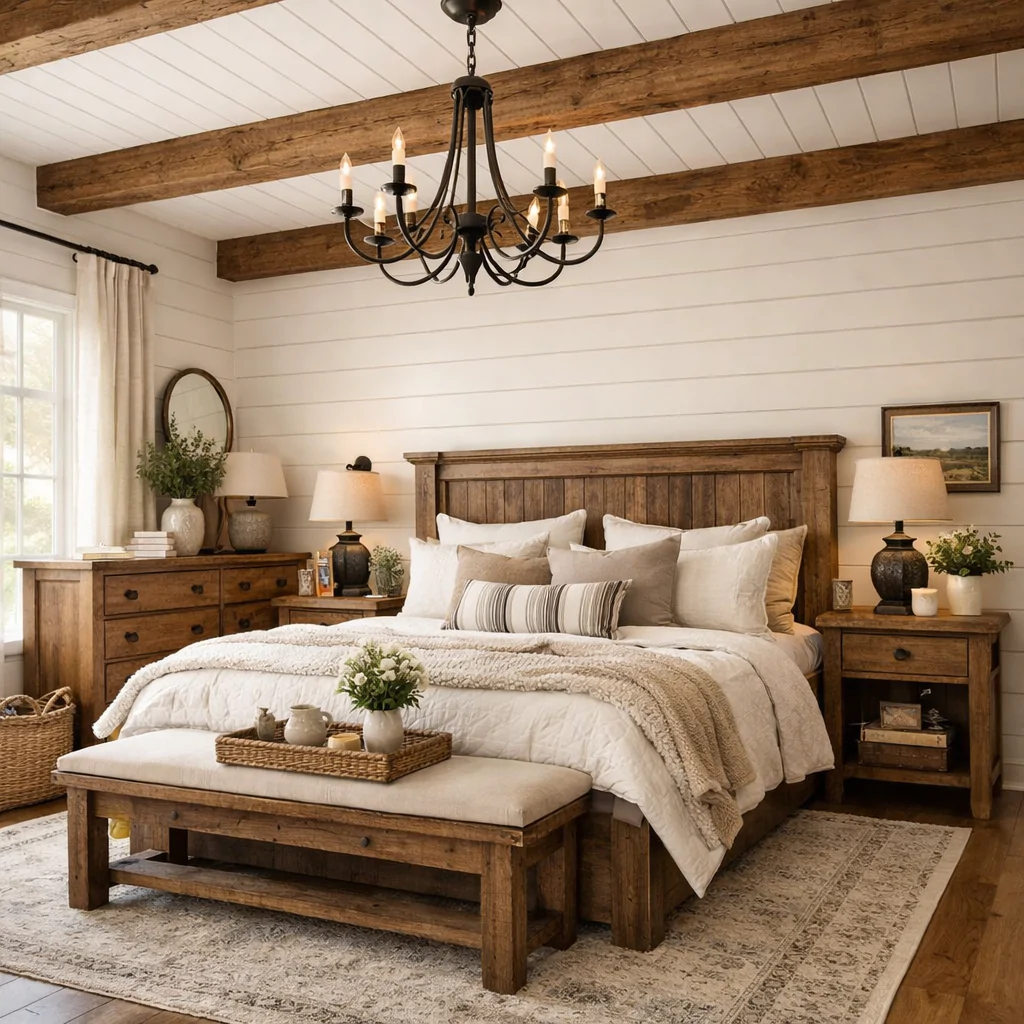 Mix white shiplap walls with wood beams for classic modern farmhouse bedrooms appeal.