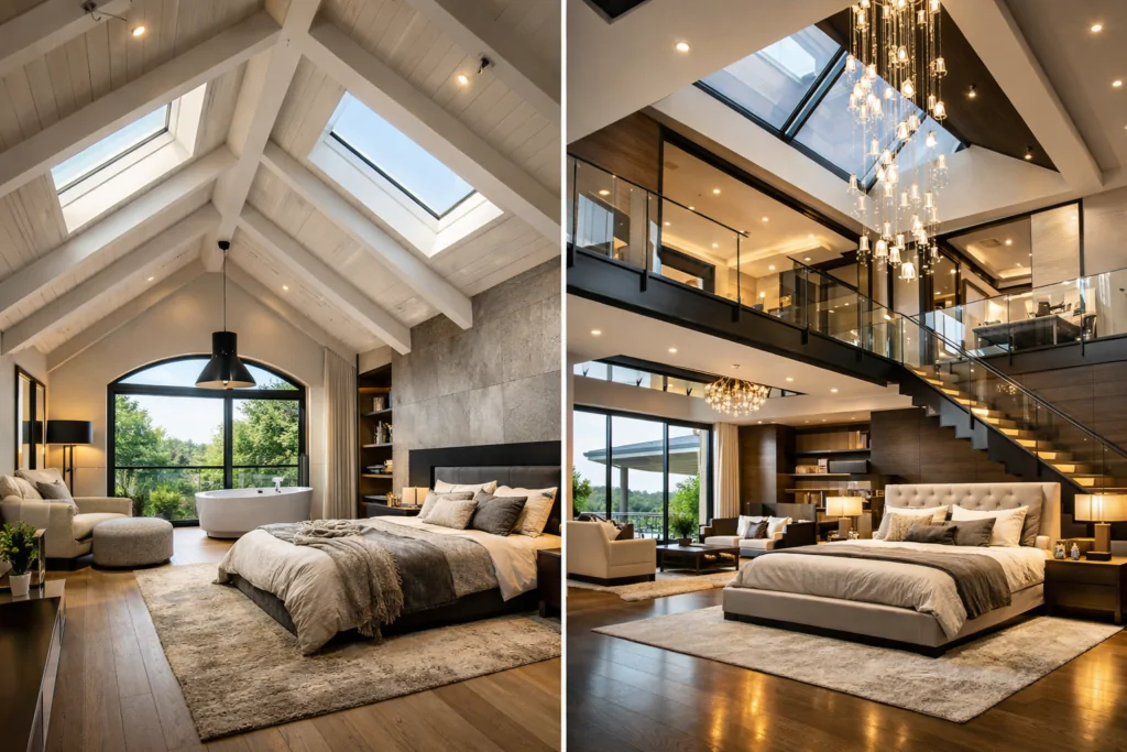 These designs work beautifully in large bedroom ideas master suite vaulted ceilings, creating vertical elegance and openness.